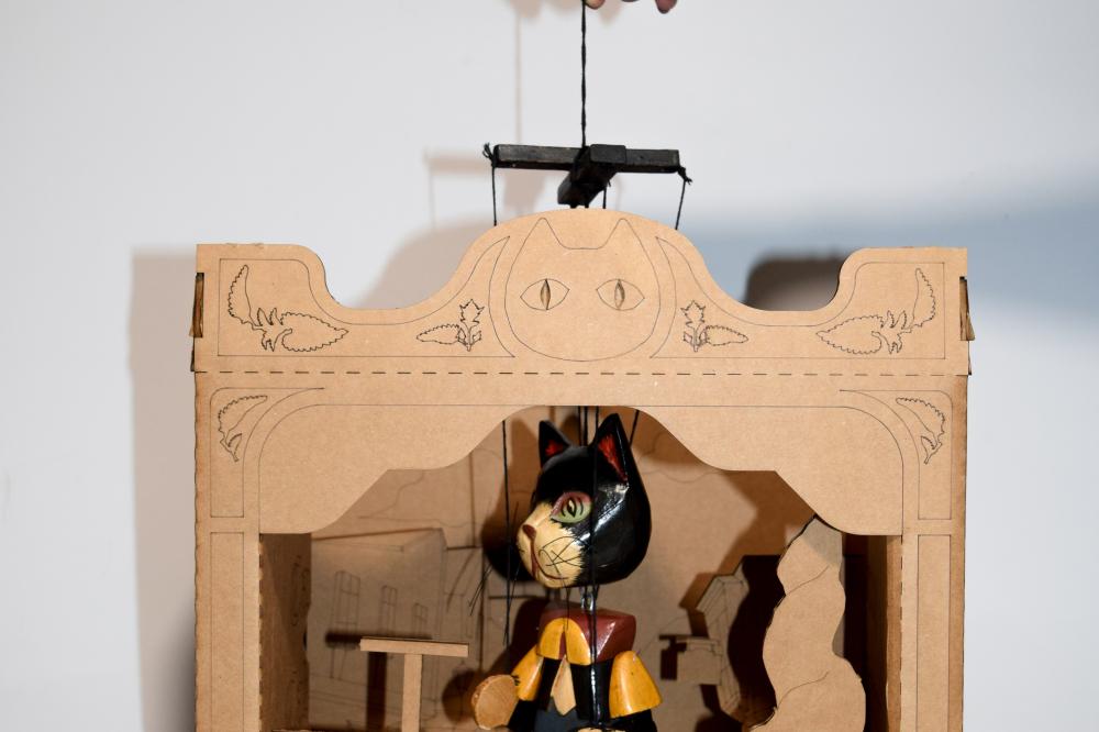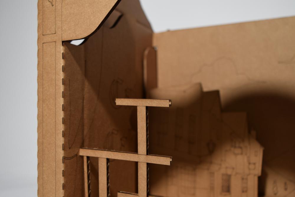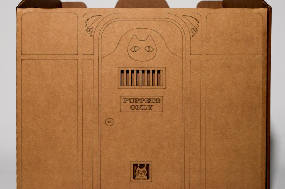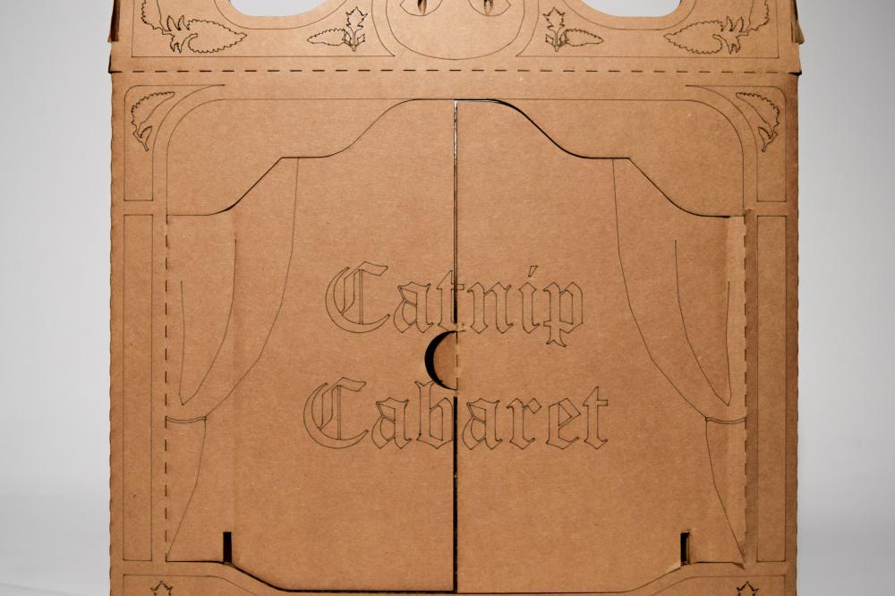 For this assignment, students were tasked with designing a cardboard box enclosure for a particular item of their choosing. This enclosure, "Catnip Cabaret," was created for a wooden marionette puppet of a cat, designed to be transformed into a miniature theater. With sustainability and functionality in mind, intricate props were built into the cardboard panels that could then be removed and used on the theater stage. Assembling the cardboard box is made easier as it can be folded out of a single cardboard piece and only one instance of adhesive was required.