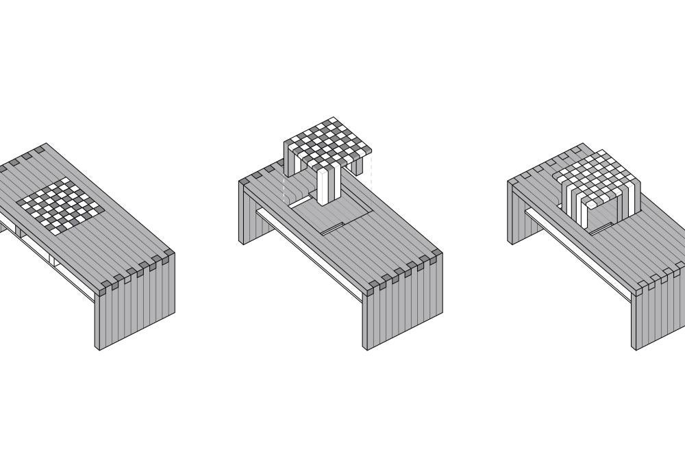 The chess board itself is situated to divide the table into implied thirds, representing the three stages of a chess match. Legs are extruded from the squares of the board to support the board in two positions; the board can be lifted out and rotated 180° for playing on the ground or at a sitting height. For contrast and compliment, African mahogany and hard maple are used in the chess board and for the table and shelf respectively.