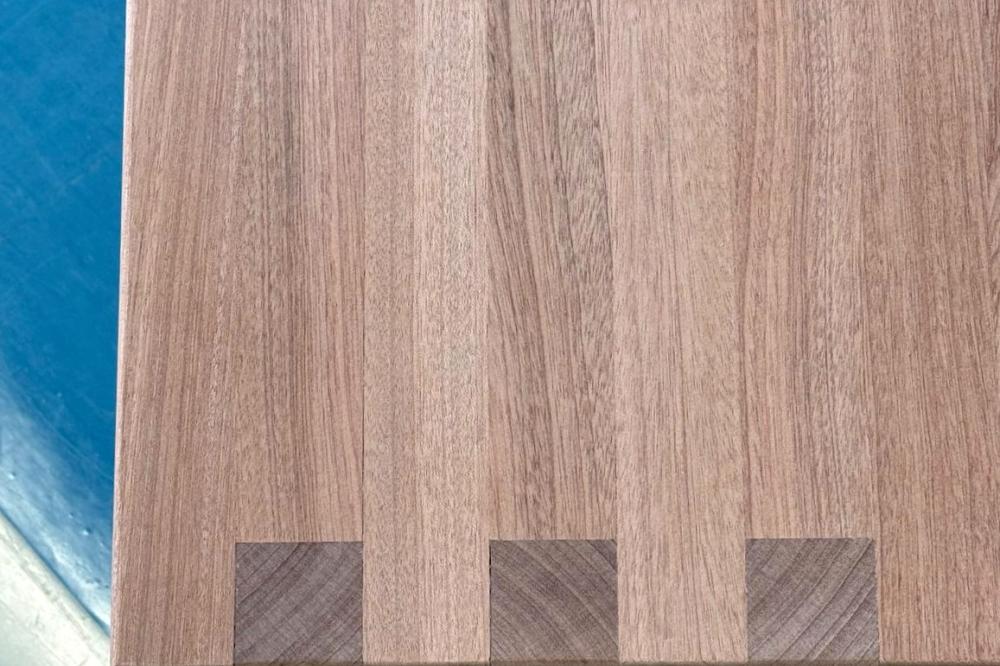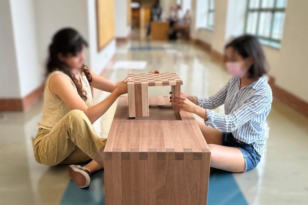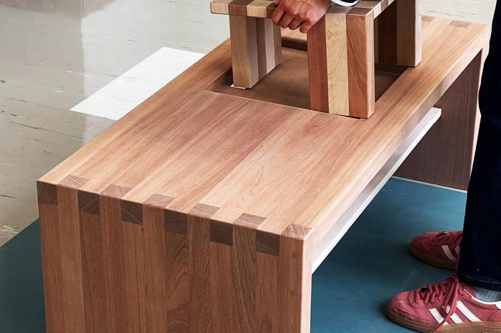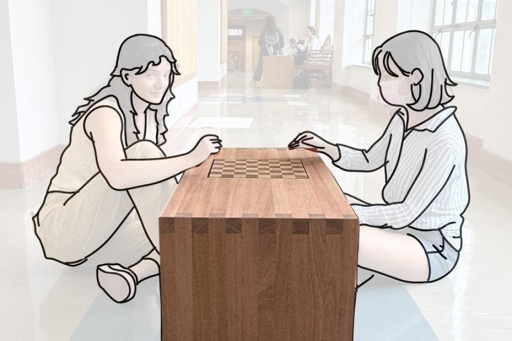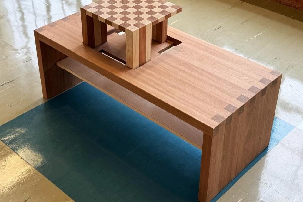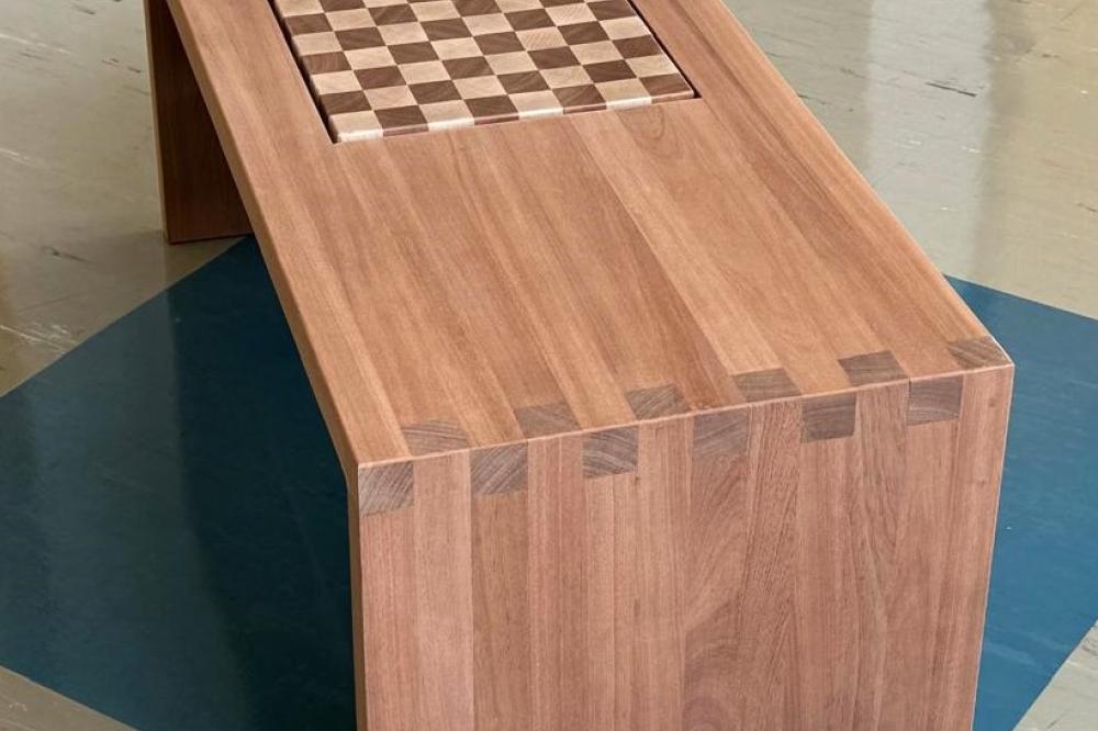 Chess, as a game of intersecting paths, serves as a design motif and function of this coffee table. Lines of extension drag the eye from the chess board out to the coffee table, marked by the end grain of finger joints.