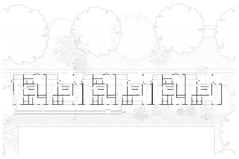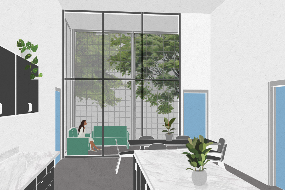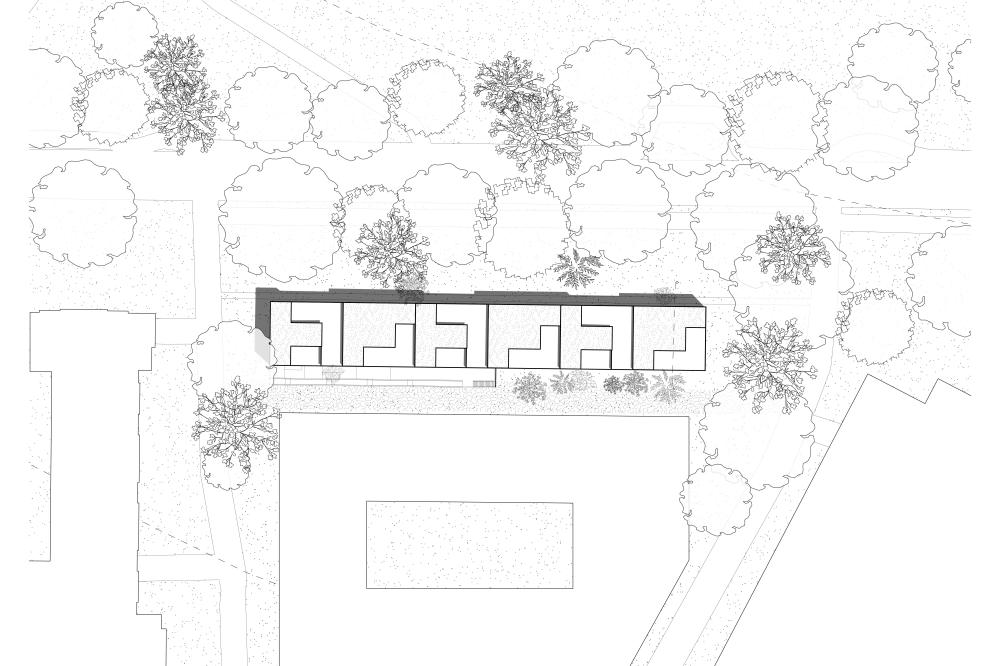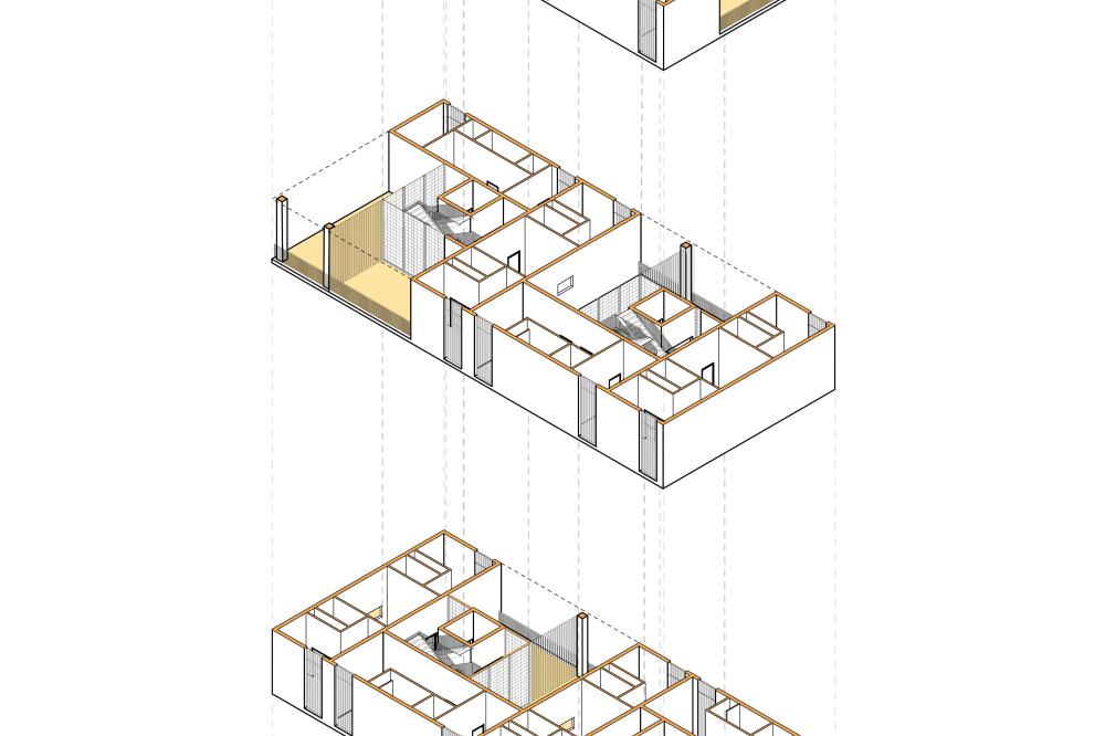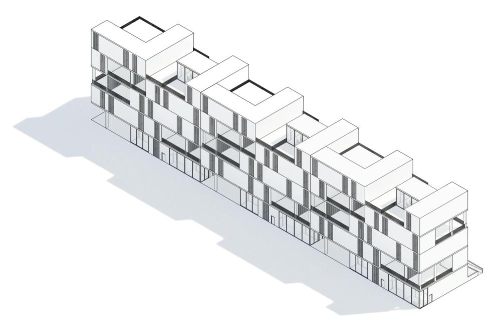 This local multi-family housing design project experiments with the idea of aggregation through both form and program. The conceptual driver is an ‘architecture of care’ mindset, where small ‘families’ live cooperatively and share amenities like kitchens and laundry and allow for a distribution of care throughout each housing ‘unit’.