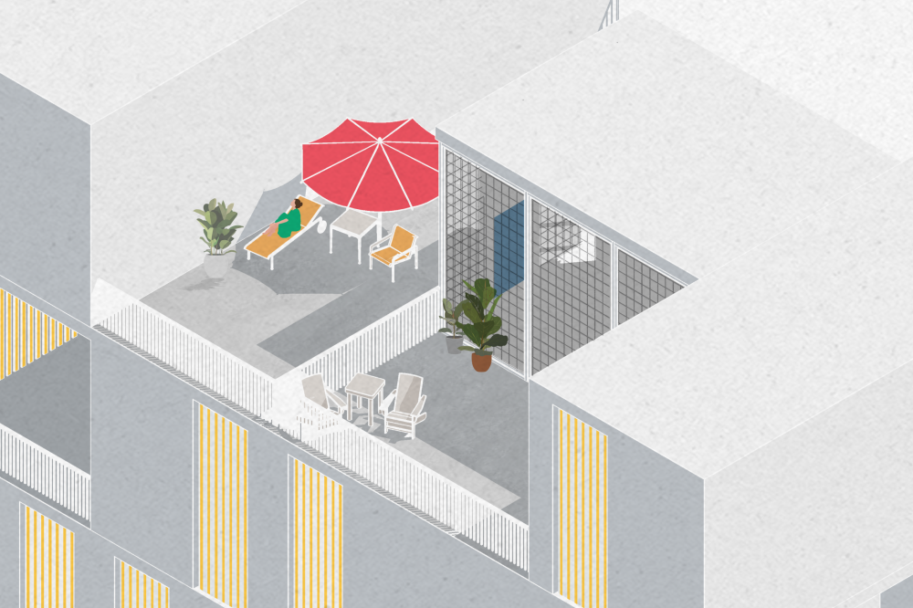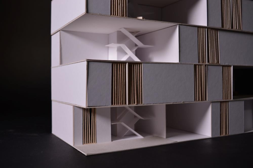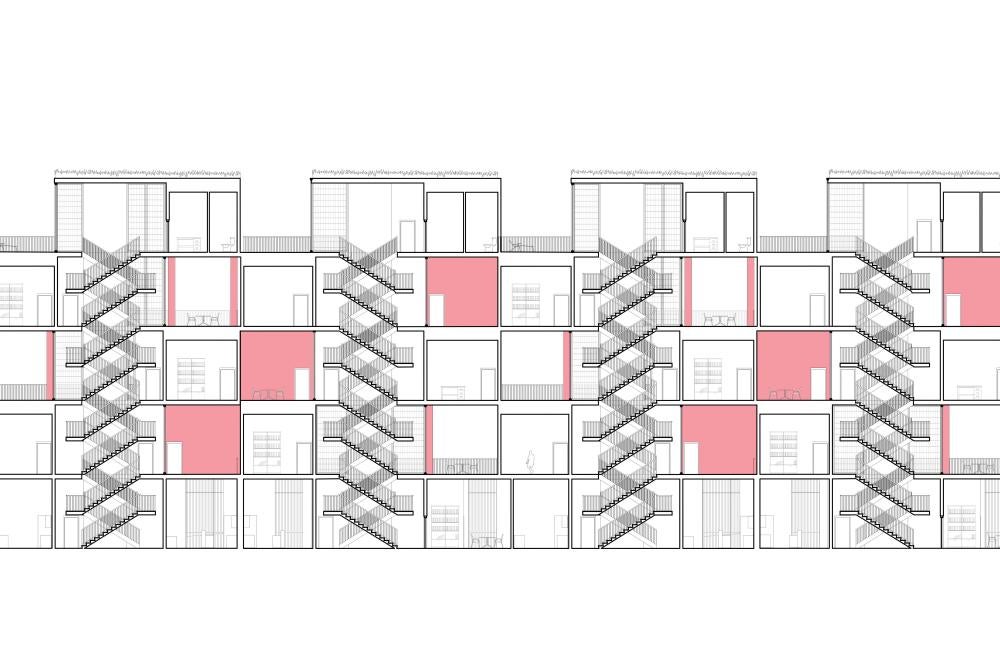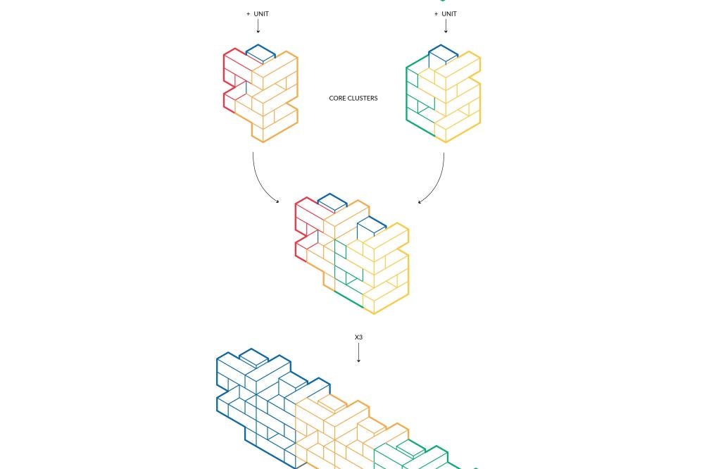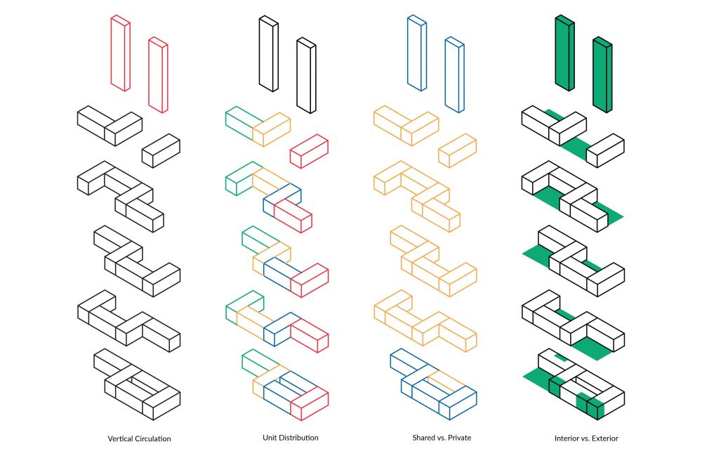 Each ‘unit’ itself is composed of ground floor shared amenities, and each floor above serves as private living spaces for each individual ‘family.’ The structure is composed of rectangular modules that aggregate around a series of six central cores, allowing for open terraces and outdoor living between modules while maintaining a dense architectural fabric. This method of formal aggregation used in this project functionally serves the cooperative living well, as two ‘units’ wrap around and share a scissor stair core and elevator, allowing for a higher level of density while maintaining privacy and separation between ‘units’.