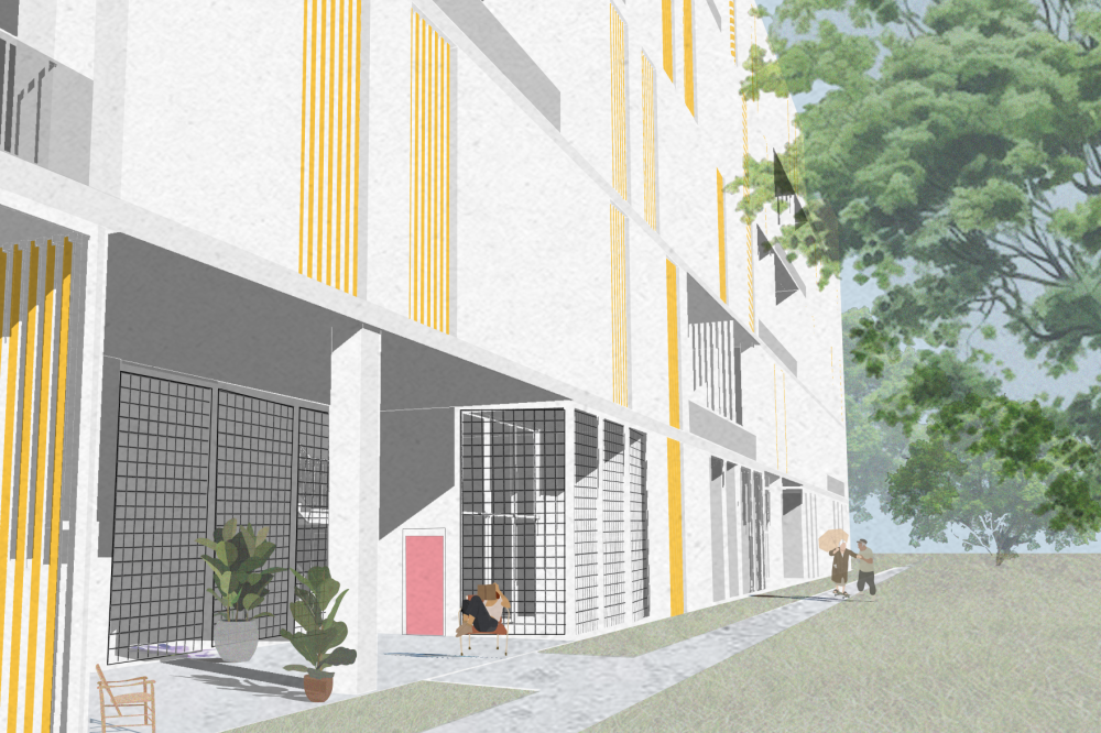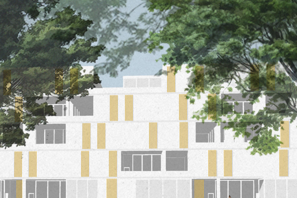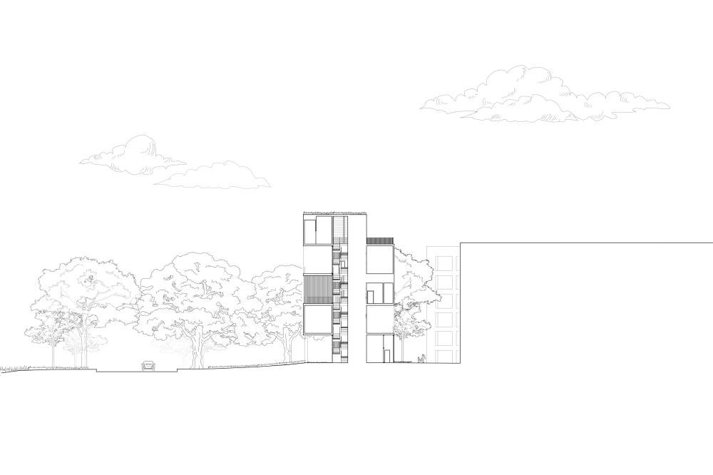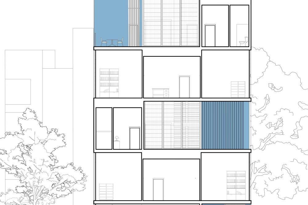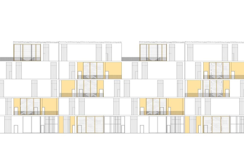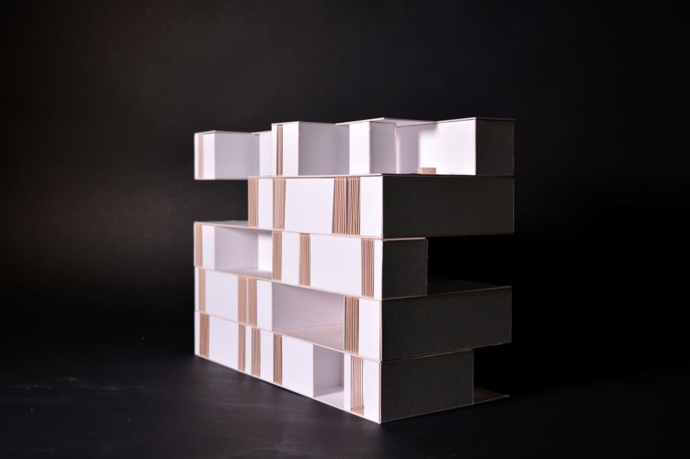 Each ‘unit’ itself is composed of ground floor shared amenities, and each floor above serves as private living spaces for each individual ‘family.’ The structure is composed of rectangular modules that aggregate around a series of six central cores, allowing for open terraces and outdoor living between modules while maintaining a dense architectural fabric. This method of formal aggregation used in this project functionally serves the cooperative living well, as two ‘units’ wrap around and share a scissor stair core and elevator, allowing for a higher level of density while maintaining privacy and separation between ‘units’.