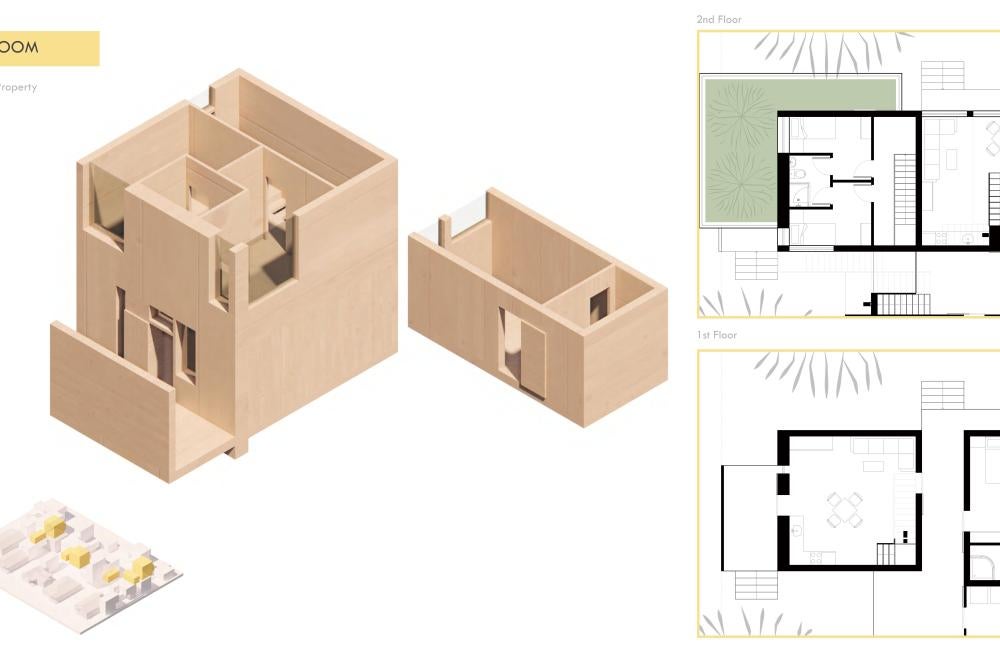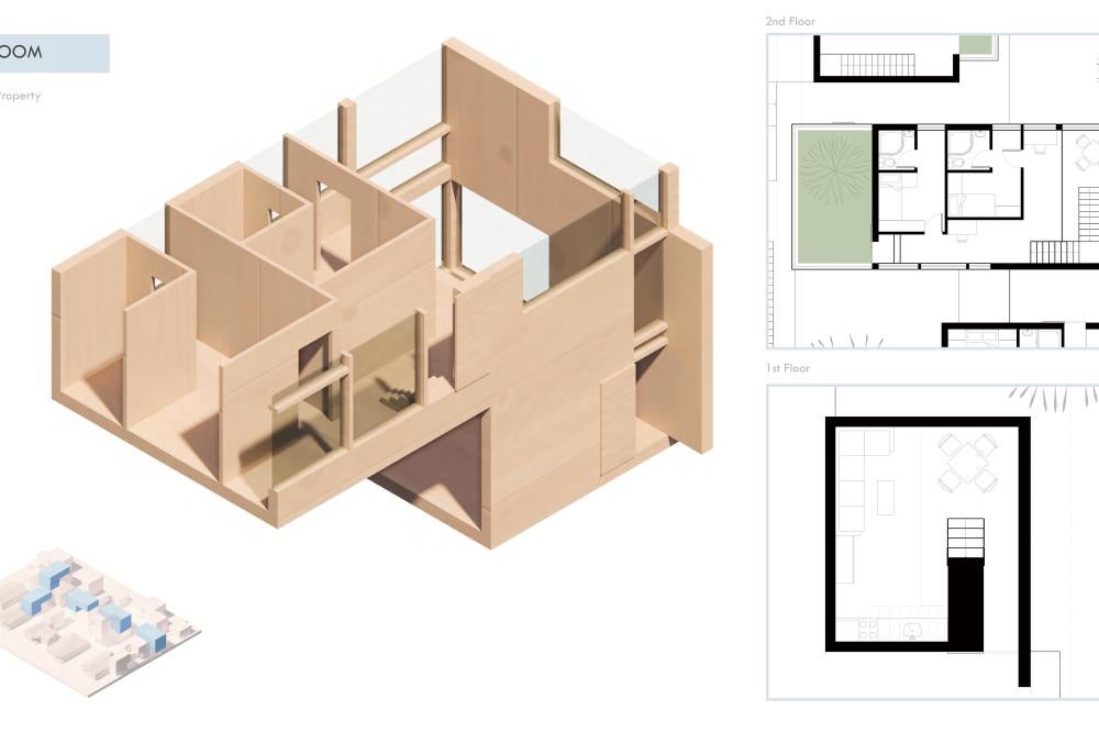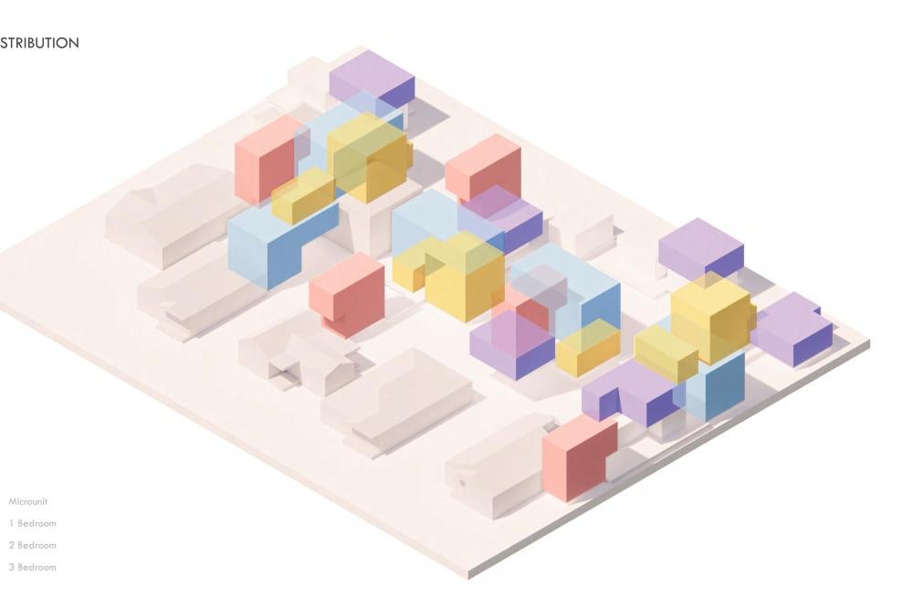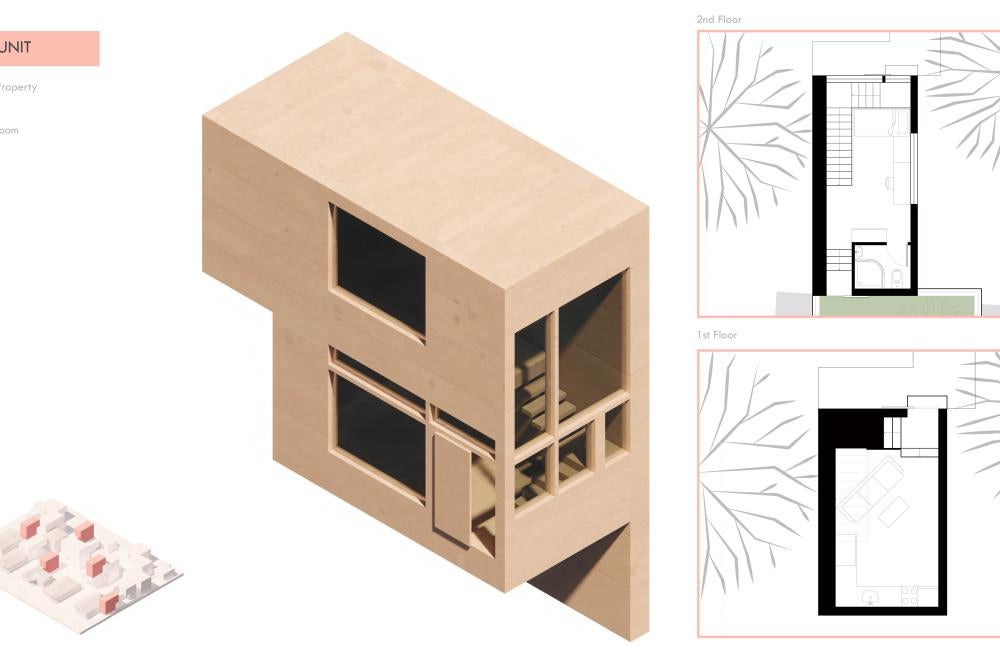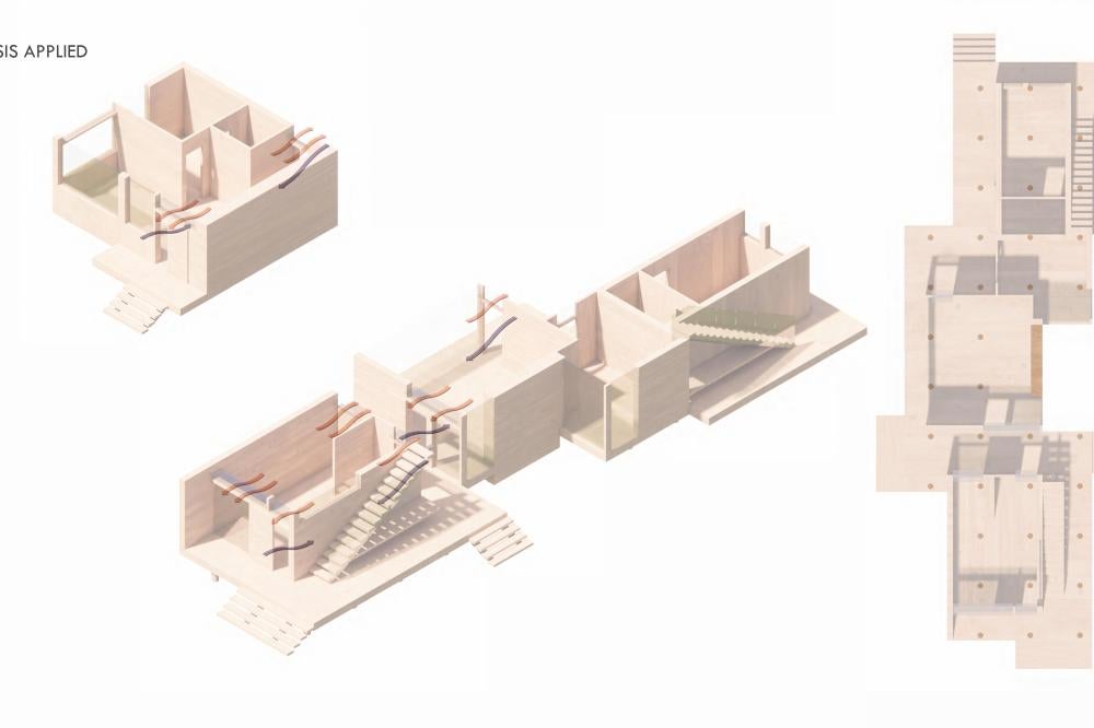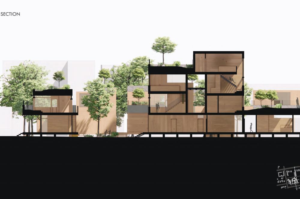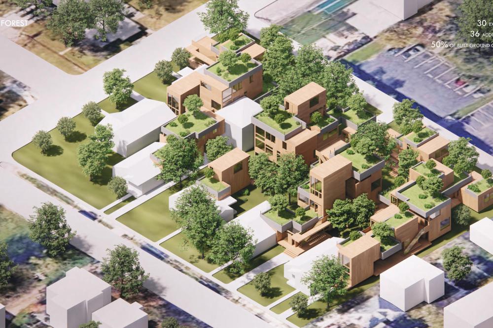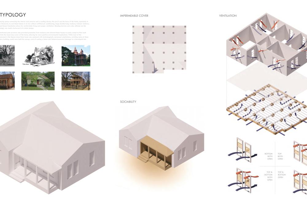 This project offers a proposal for how to approach the oncoming densification of East Austin, including urban forest and an economic strategy to help bridge the transition between commercial and residential sectors surrounding the site. This series of residencies looks to engage passive systems of cooling as well as the social implications of the porch as circulation. A variety of units house different sizes of families and accommodate spaces for communal gathering through a series of courtyard-esque spaces formed around pre-existing trees on the site and verandas. Green “pots” of trees create shared spaces between units and lessen any imposing nature of the building’s verticality over existing homes. The overall building is conscious of the area while creating a unique space to live and a nature-oriented space for locals to gather and socialize.