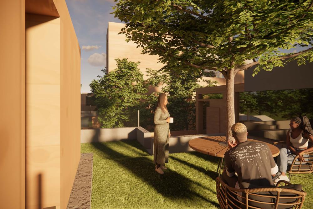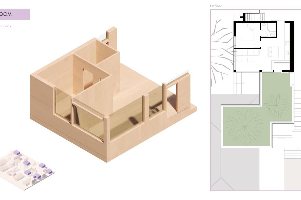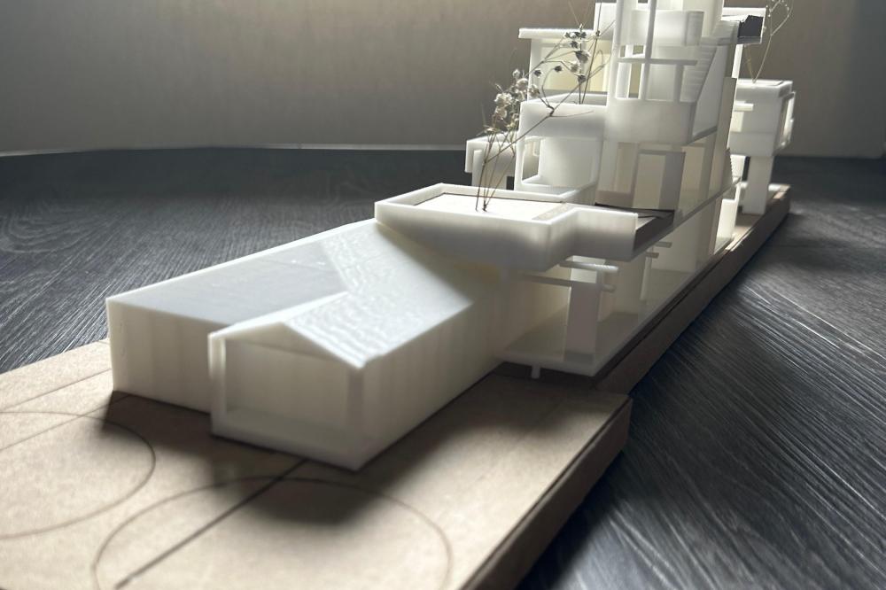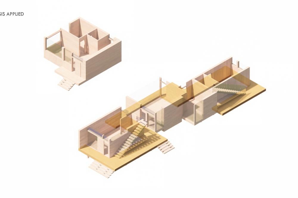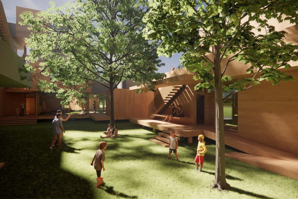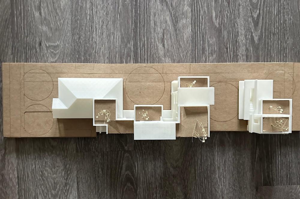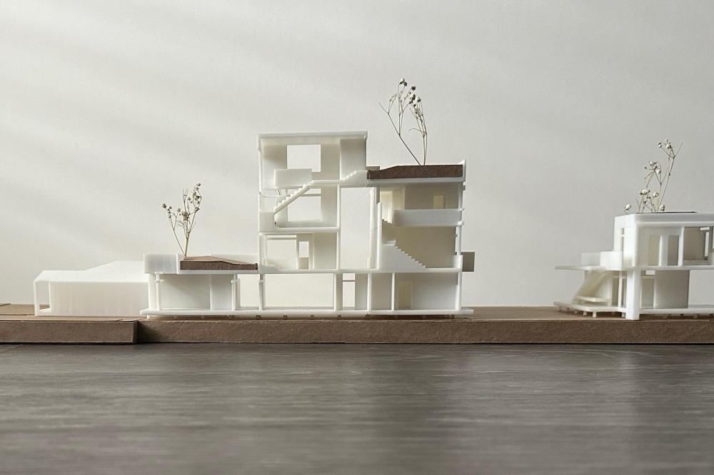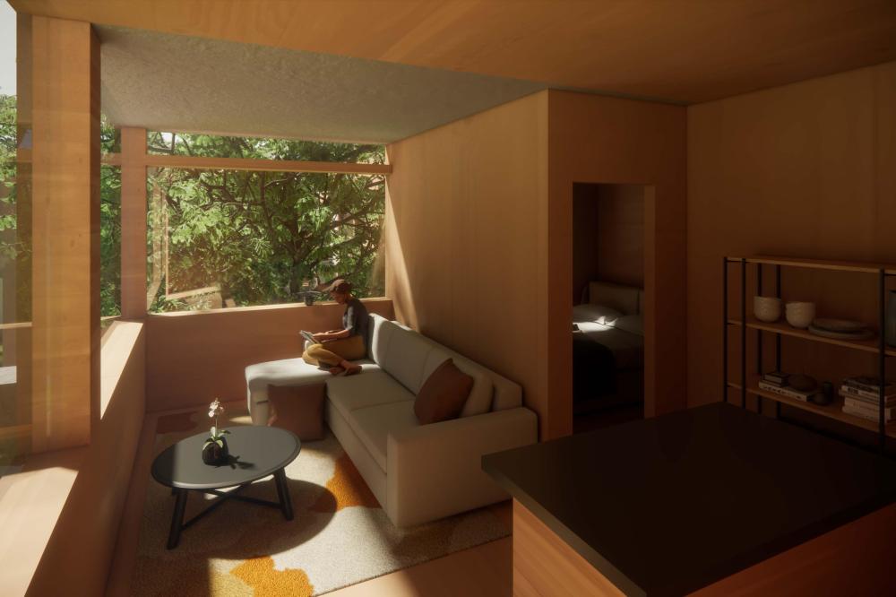 This project offers a proposal for how to approach the oncoming densification of East Austin, including urban forest and an economic strategy to help bridge the transition between commercial and residential sectors surrounding the site. This series of residencies looks to engage passive systems of cooling as well as the social implications of the porch as circulation. A variety of units house different sizes of families and accommodate spaces for communal gathering through a series of courtyard-esque spaces formed around pre-existing trees on the site and verandas. Green “pots” of trees create shared spaces between units and lessen any imposing nature of the building’s verticality over existing homes. The overall building is conscious of the area while creating a unique space to live and a nature-oriented space for locals to gather and socialize.