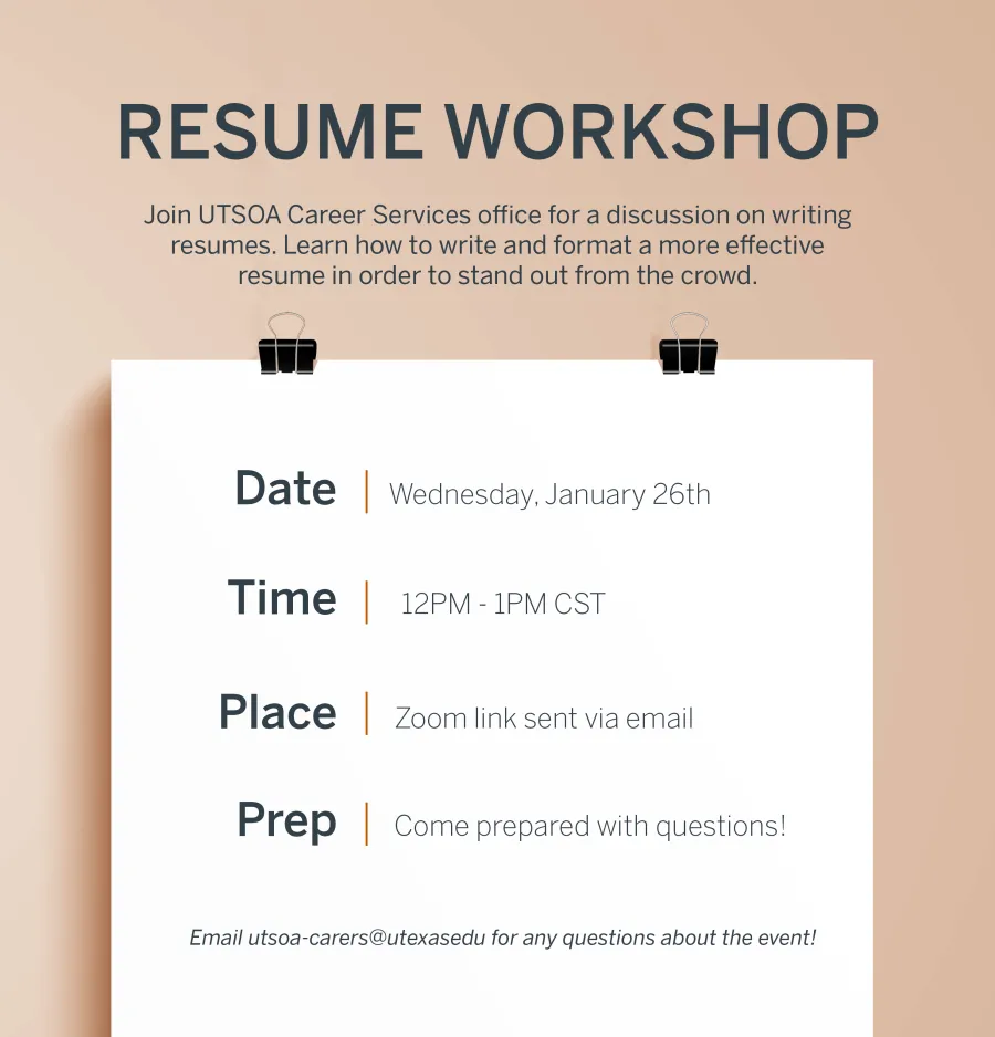 Join Career Services for a discussion on writing resumes. Learn how to write and format a more effective resume and stand out from the crowd! This event will be held in the Career Services office, Sutton Hall 3.128.