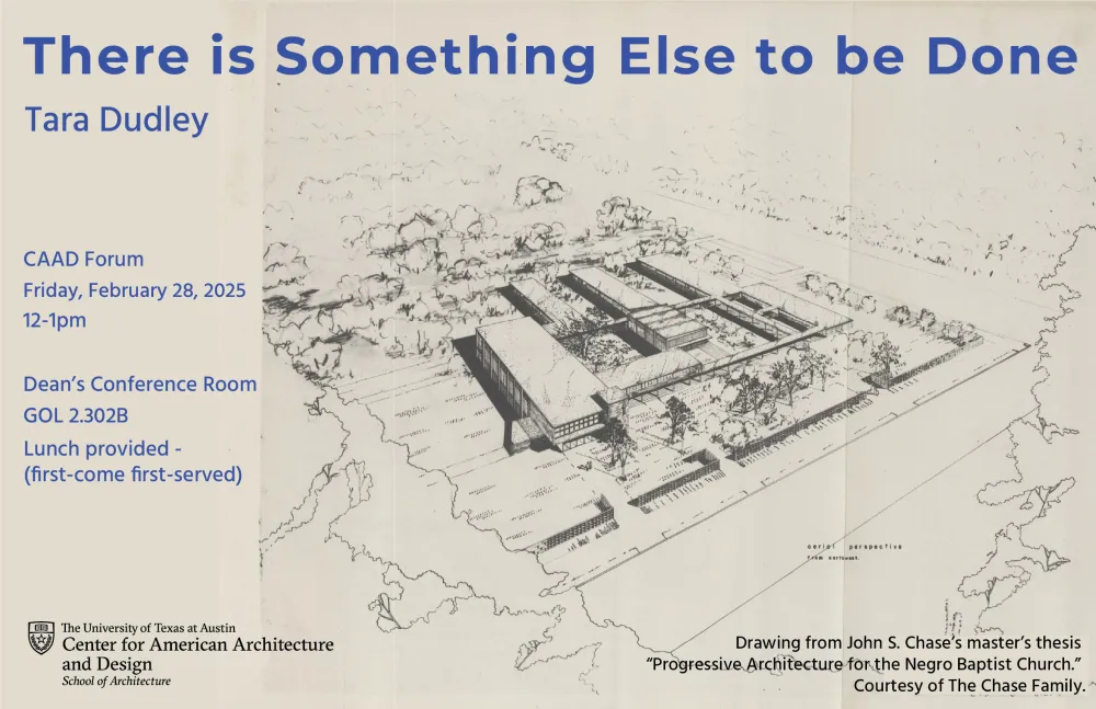 The CAAD Forum series is hosted by the Center for American Architecture and Design to bring faculty, students, and staff together for informal and inquisitive discussions about ideas relating to architecture and its history, theory, practice, and future. Presentations introduce and off insight into new and ongoing research, and are followed by time for Q&A. Lunch provided; first-come first-served. View past CAAD Forums on the Texas Architecture YouTube channel.