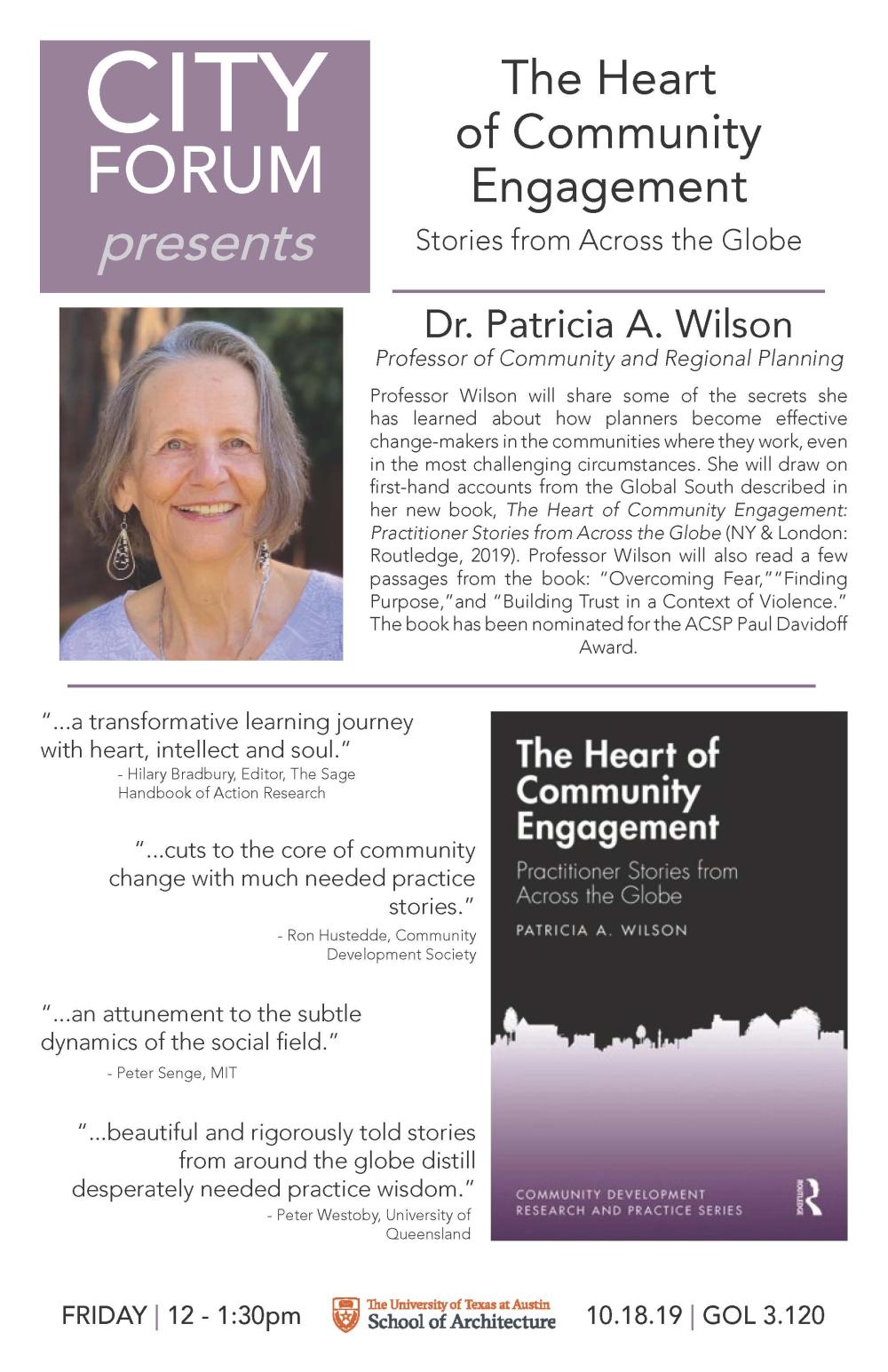 Professor Wilson will share some of the secrets she has learned about how planners become effective change-makers in the communities where they work. She will draw on first-hand accounts from the Global South described in her new book, The Heart of Community Engagement: Practitioner Stories from Across the Globe (NY & London: Routledge, 2019). Professor Wilson will also read a few passages from the book: “Overcoming Fear”, “Finding Purpose,” and “Building Trust in a Context of Violence.” The book has been nominated for the ACSP Paul Davidoff Award.