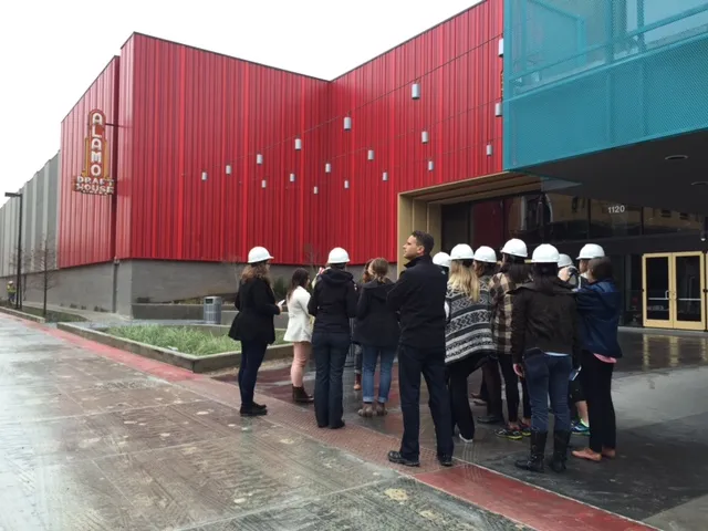 From the architect: "The design for this ground-up mixed-use development provides a varied urban experience while capturing the character of its south Austin neighborhood. The site, home to the iconic Alamo Drafthouse Cinema, incorporates three buildings of varying heights with an internal drive that terminates in a pedestrian plaza anchored by the theater. The design for the façade of the Alamo Drafthouse addition is inspired by vintage theater components and the iconic red stage curtain. The ground level mixes local retail and restaurant tenants, all encouraged to assert their identities through individually designed storefronts. The apartment blocks above are clad in two tones of metal panels, accented with wood and bold colors that vary across the façade. Large glassy volumes anchor each main building, housing club amenities that provide a direct interaction with the residents to the streetscape. Along Treadwell, the development steps down in scale with two-story walk-up units clad in undulating masonry. A community garden and integral bike trail follow the west side of the project closest to the residential neighborhood. In collaboration with BOKA Powell." Tracie Gesch, an interior designer at Michael Hsu Office of Architecture, provided a tour of the job site in progress.