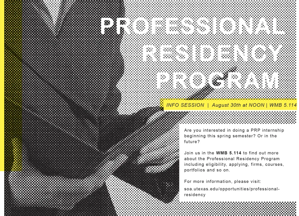 The Professional Residency Program [PRP] offers upper-level architecture students a unique opportunity to expand their education through work experience in the architectural profession. Join us for the PRP Information Session THIS Friday, August 30th at 12pm in WMB 5.114. This is a required meeting for those interested in applying for Residency this semester. We will discuss eligibility requirements, application, placement process, firms and schedule at that time. It is also a great opportunity to learn more for those planning ahead.