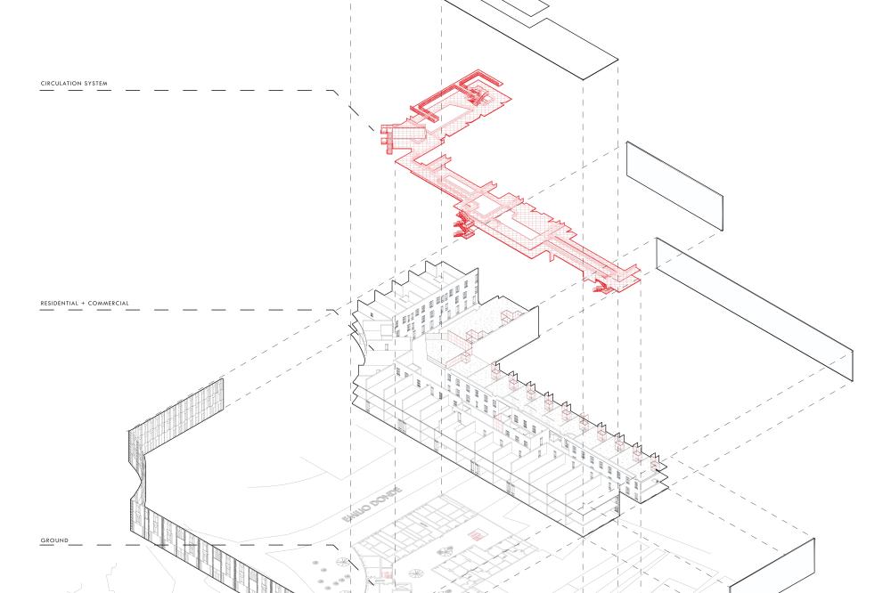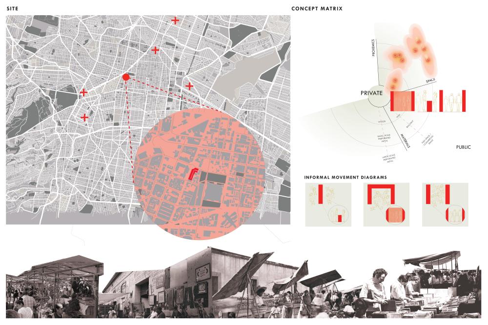 Mexico City’s tianguis markets emerge both architecturally and as a response to community needs, adapting to existing infrastructure and creating a set of unique spatial and social conditions. Inspired by the transient and fixed forms, informal movement patterns and user interaction within the tianguis, Emergence proposes an adaptive mechanism to address reuse and user needs over time in a mixed-use housing development sited in the historic Edificio Gaona. The intervention allows users to interact and reclaim public space within the historic structure, while creating opportunities for affordability and privacy within and between units.