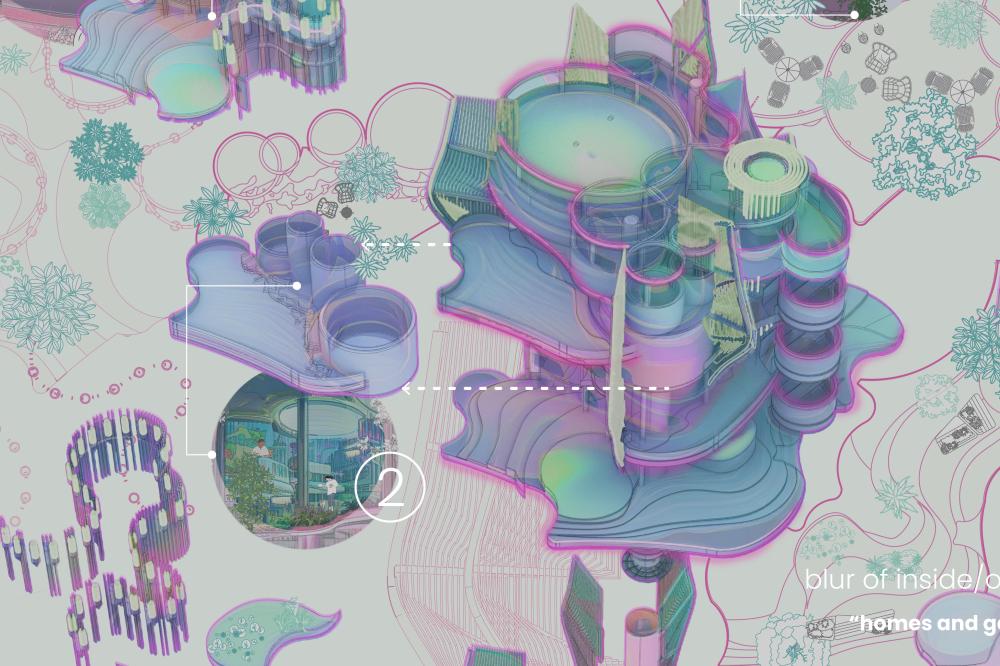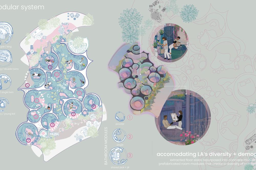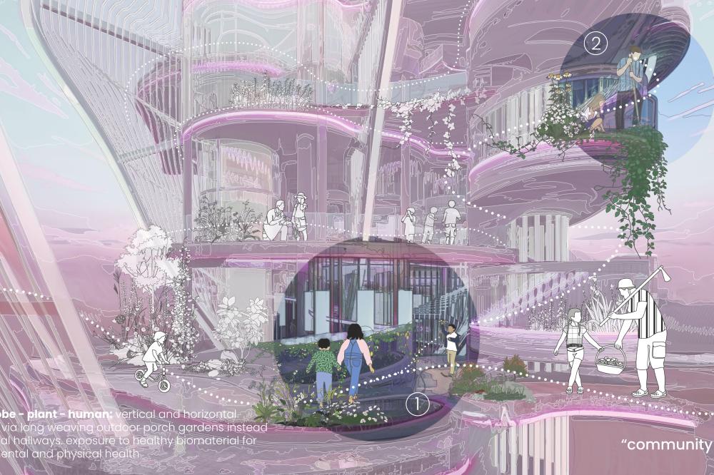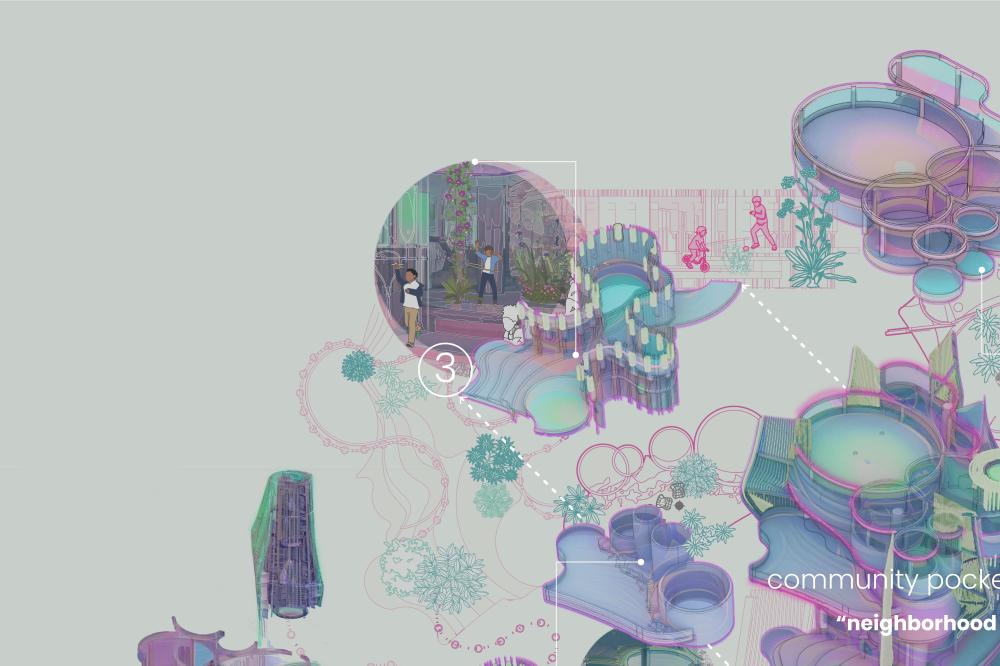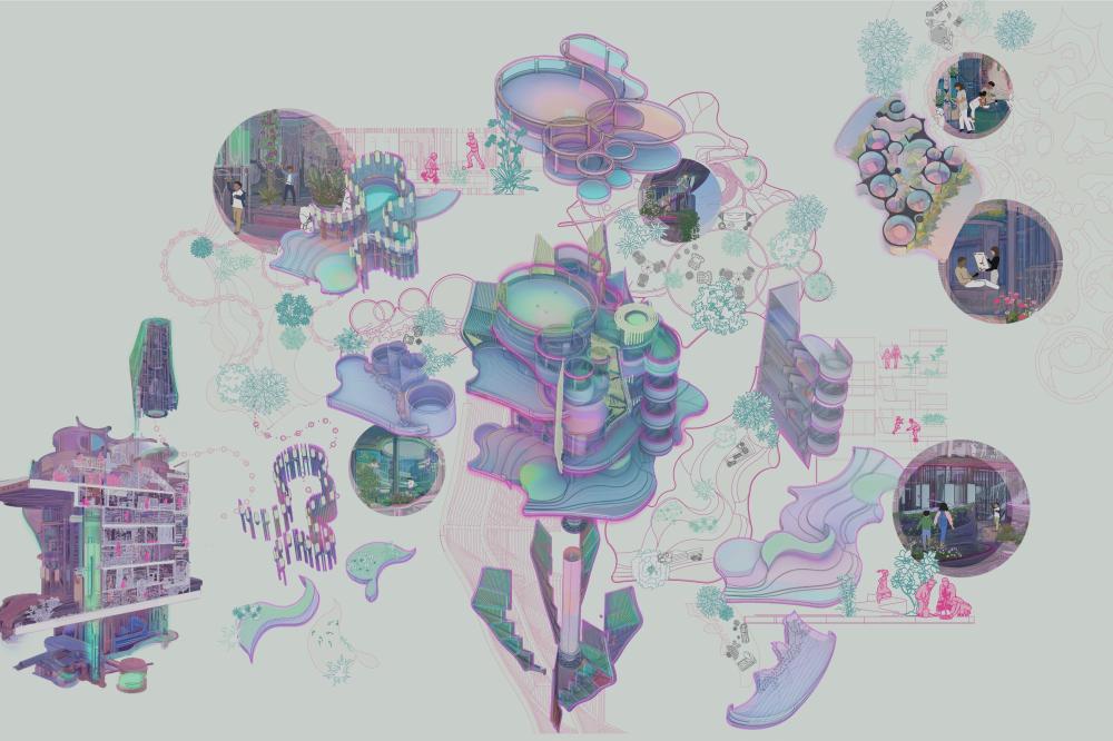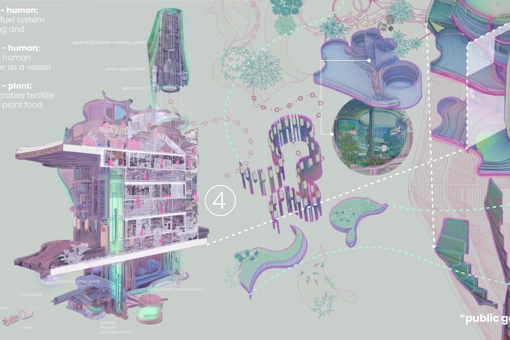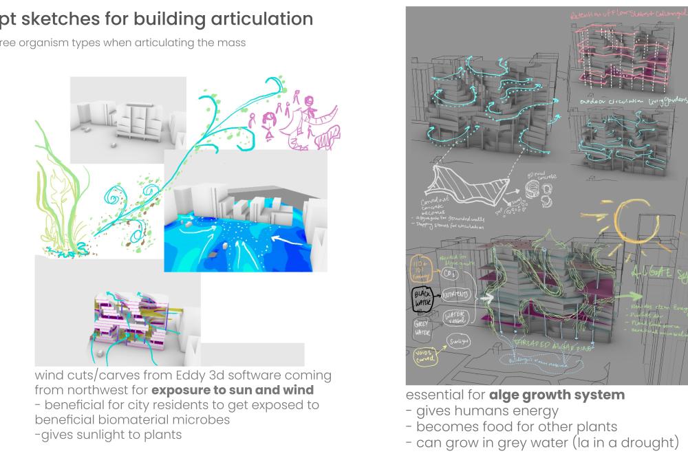 In a city grappling with the challenges of urban sprawl and diminishing sense of community, such as Los Angeles, this project creates a symbiotic living system that integrates diverse forms of life—microorganisms, plantae/fungi, and animals (including humans)—within a vertical framework, departing from the conventional horizontal urban sprawl.