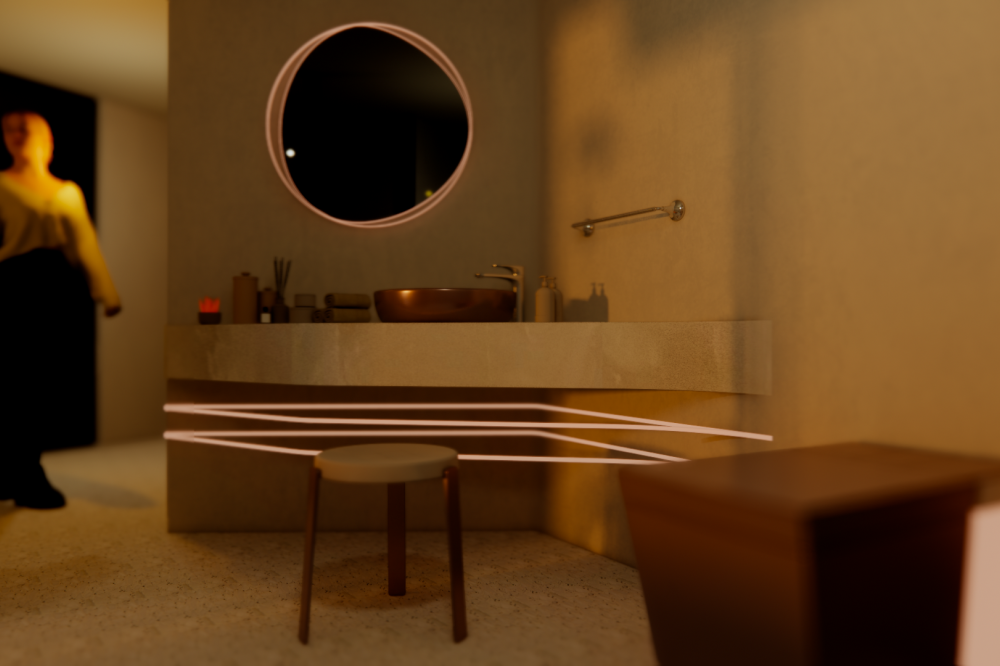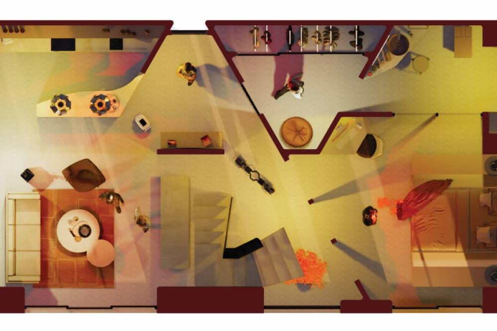 The pathways within the hotel employ a strategic use of light to create 'serial framing'—a technique where similar frames repeat to guide the guest’s journey. Additionally, the inclusion of interactive holograms along these paths enhances guest interaction, providing a dynamic and immersive experience reminiscent of the film’s own narrative depth.