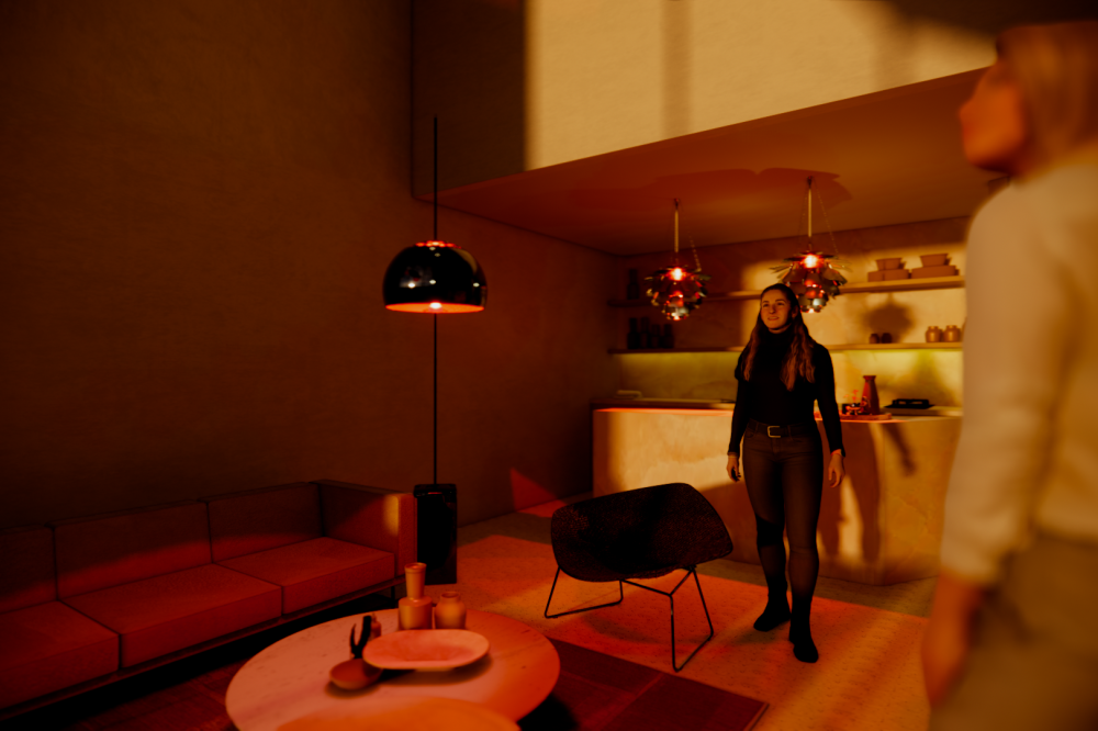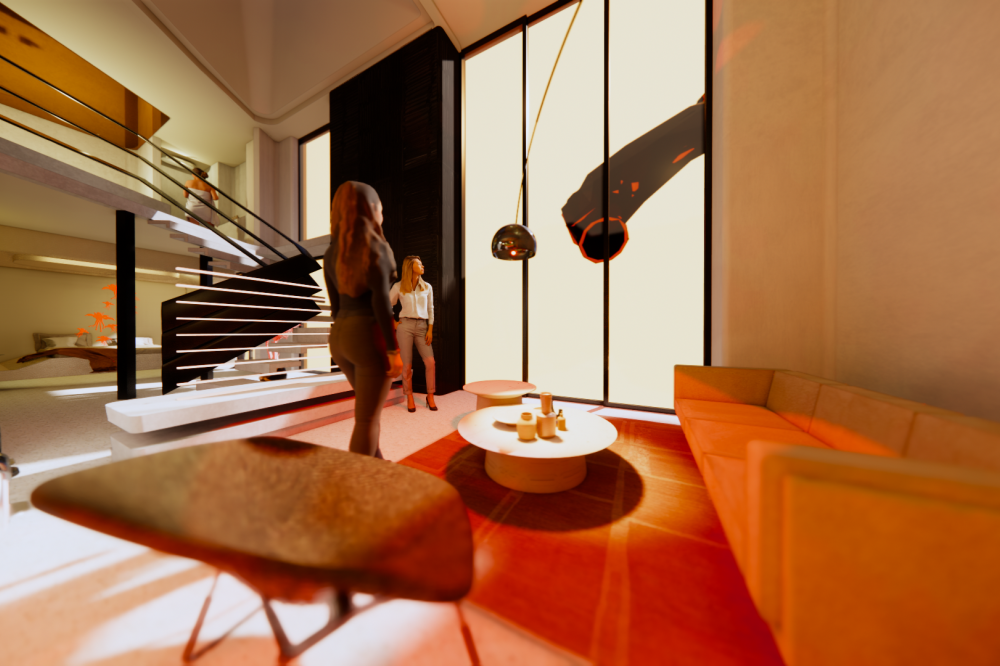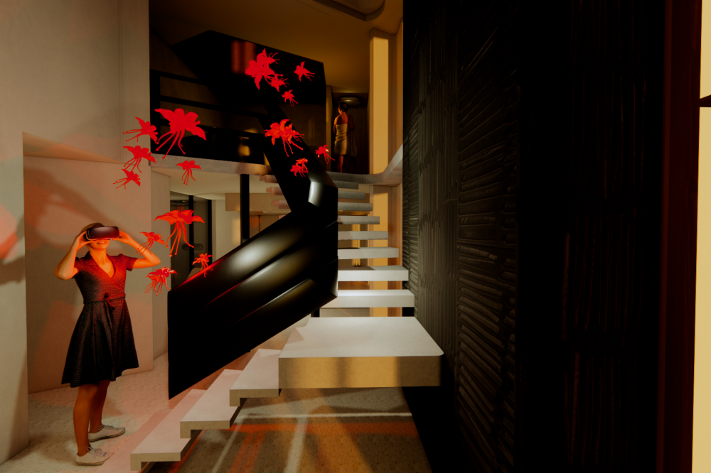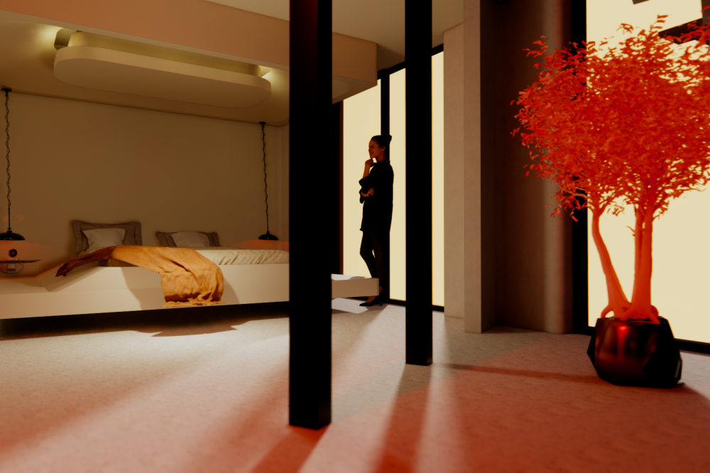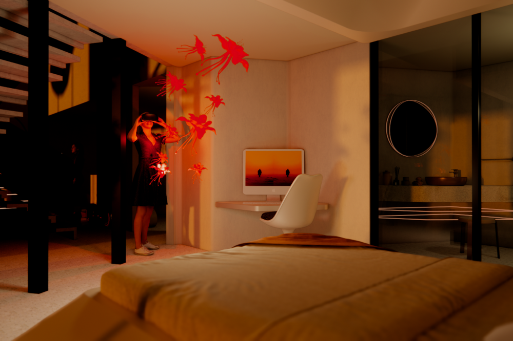 The design incorporates innovative features that enhance the futuristic vibe of the hotel. Floating flowers, seen in the renders, interact with guests in various ways, such as providing tours or entertainment, symbolizing how future technologies might integrate more seamlessly into our social spaces. Additionally, the hotel features advanced holographic TVs and various types of projections, which not only serve entertainment purposes but also blend seamlessly with architectural aesthetics, further emphasizing the futuristic theme.