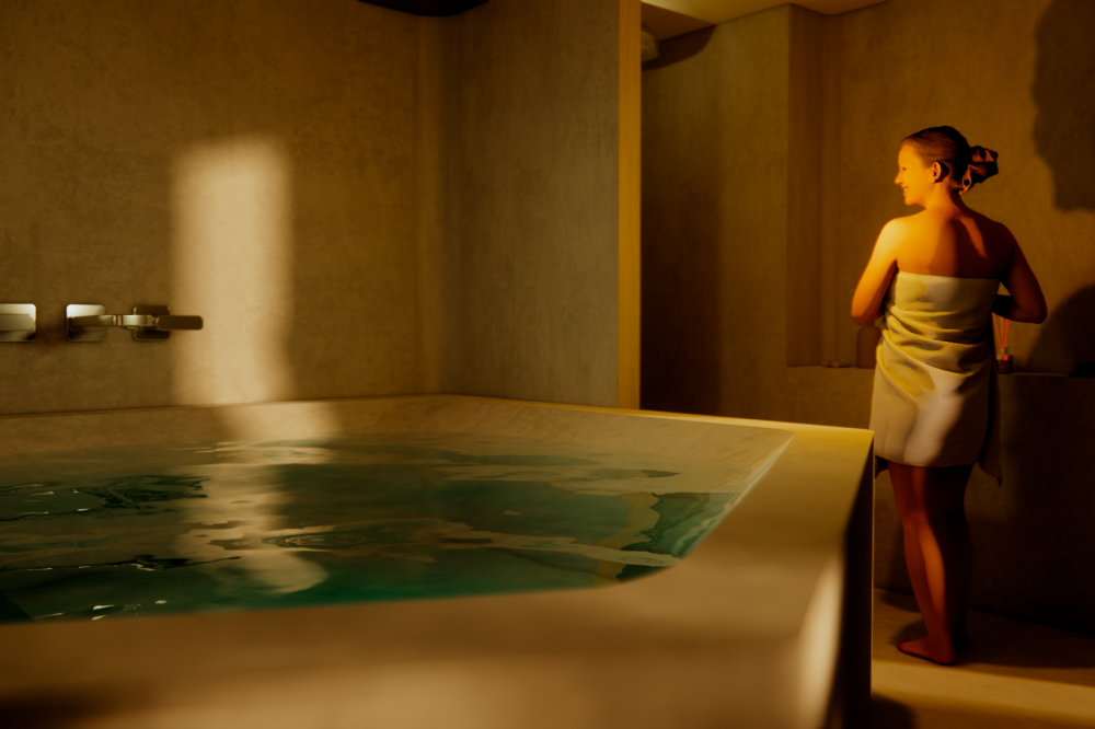 The design journey begins with the arrival experience, characterized by a monumental artificial skylight and a shallow pool beneath it. This setup not only enhances the natural light but also manipulates it to create mesmerizing water caustics that dance on the surfaces, embedding a lasting visual memory for guests. This interplay of light and shadow introduces a sense of mystery and beauty, crafting an enchanting atmosphere right from the first encounter.