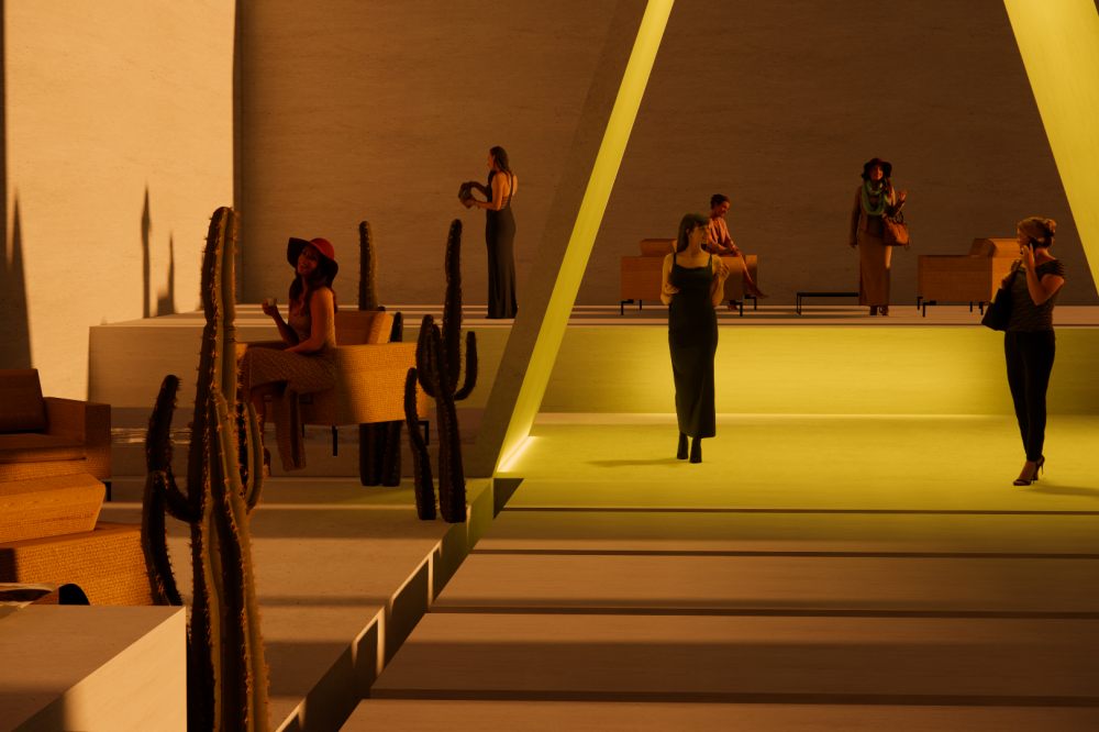 Drawing inspiration from the "throne island" scene in Blade Runner 2049, the hotel’s outdoor spaces are designed around a monumental sculpture that acts both as a gateway and a central showpiece. This area, characterized by minimal furnishings and strategic lighting, emphasizes the powerful interplay of light and water, creating a communal space that invites guests to gather, interact, and celebrate life.
