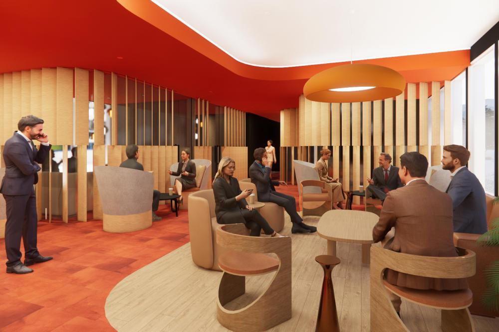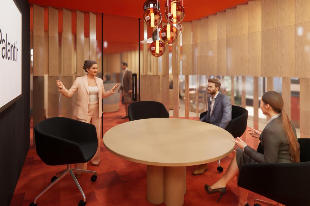 Palantir strives for innovation and originality. Keeping this in mind, the wooden panel system is designed to create dynamic moments with modular elements that enhance the users’ sense of perception. Such an approach shifts users' points of view according to their position within the space, evoking curiosity as they catch a glimpse into the meeting rooms.