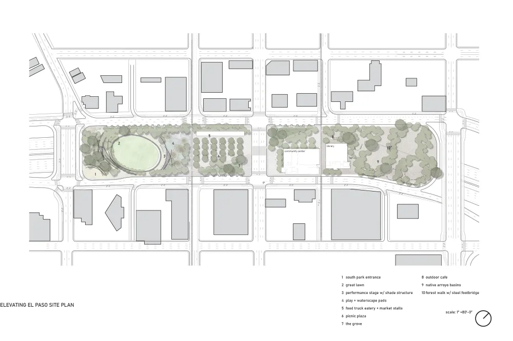 Natural features of the Chihuahuan desert are seen through large arroyo basins that collect and slow stormwater, while native vegetation provides a scenic atmosphere and brings necessary shade to the hot desert climate. This design proposal addresses the goals and initiatives of the Paso del Norte Health Foundation to ensure that the El Paso community has access to resources and an environment that supports healthy living.