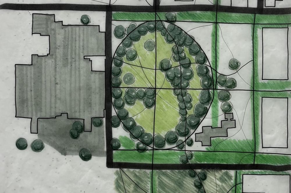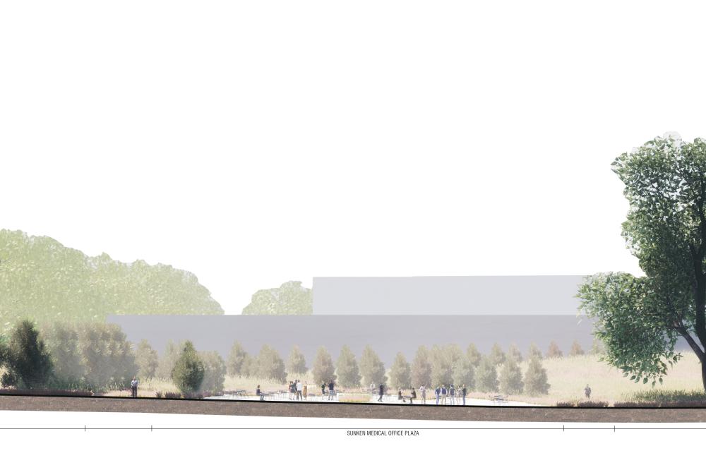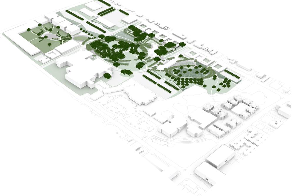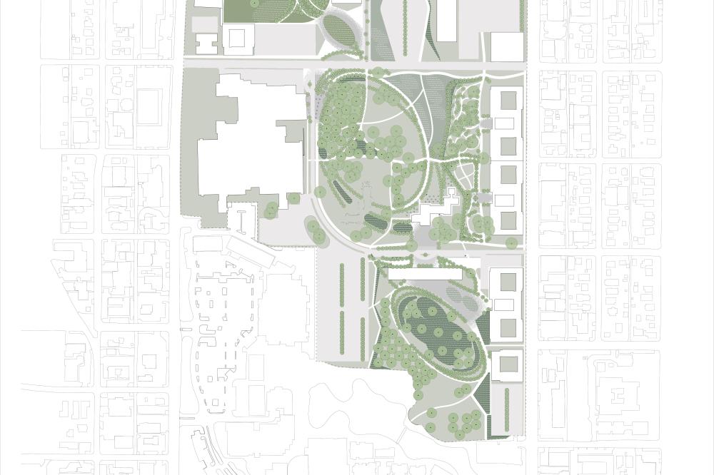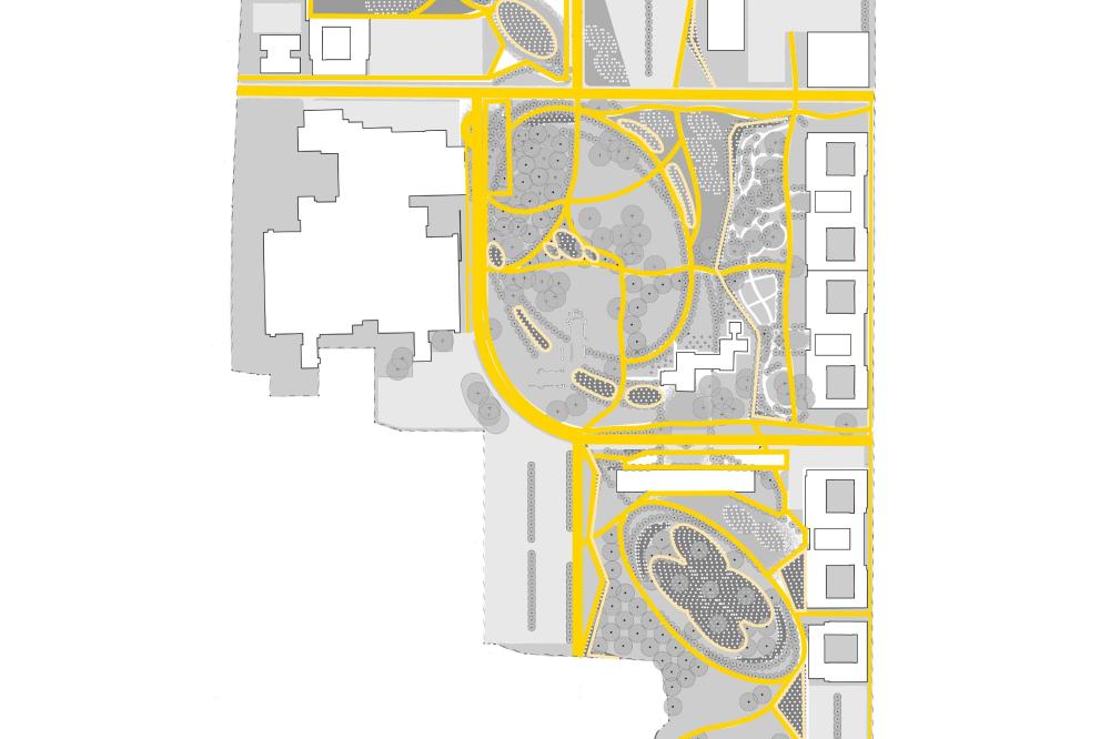 Fragments reflect historic land uses of the site. Utilizing an early aerial of the site, fragments were identified as farmland, urban core, and a picturesque grove. While there were many troubling thoughts on the treatment of mental illness at this time, the hospital did have a focus of creating working gardens and strolling parkland for patients to better connect with nature. This was an idea that Healing Fragments sought to restore. Gold, or the healing glue, shows the proposed intervention and how the cracks and fragments are glued together using circulation and vegetation.