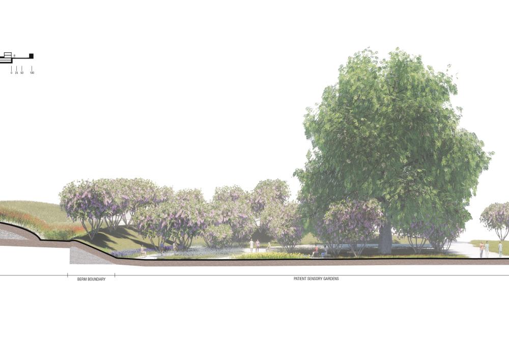 Healing Fragments improves the environment by reducing impervious cover through utilizing permeable paving as well as removing large areas previously used for surface lot parking and increasing tree canopy coverage. Healing Fragments provides healing spaces that promote health such as the Yoga Garden, Sensory Garden, Zen Garden, and Working Garden to help patients connect with nature and their environment. Healing Fragments utilizes vegetation and berms to allow areas for public and private use as well as spaces for different user groups.