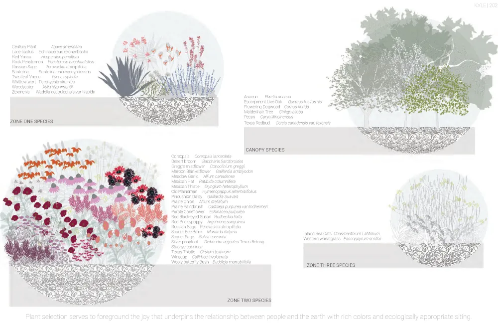The final module seeks to develop a regenerative infrastructure for health through design, resulting in a public landscape that interrogates the history of the medicinal garden, adapting its form and purpose for 21st-century needs. The students were tasked with designing the Heman Sweatt Campus as a restorative space for human inhabitants - local communities, visitors, medical district employees – and non-human beings – plants, animals, soil microbes. The landscape is a gateway to the Medical District, linking the Central Core Campus north of MLK to points south, including the health institutes, School of Nursing, Dell Medical School, and Dell Seton Medical Center. As such, it should be inviting to diverse inhabitants and legible as regenerative infrastructure. This landscape also must facilitate the social and academic life of the medical district community by providing a space for human interaction that supports learning, experimentation, and collaboration.