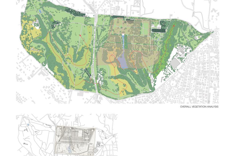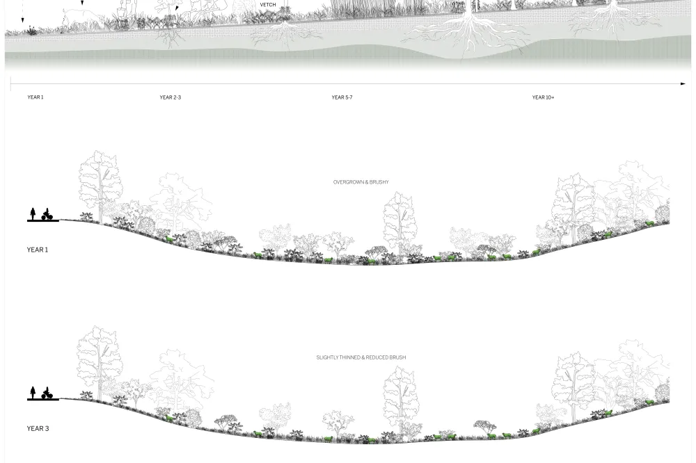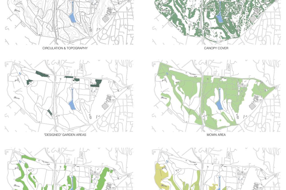 Landscape typology mapping was conducted through in person experience, as well as through ground and aerial photography. The categories of landscape typology studied were canopy cover, mown grass, tall grass, dense undergrowth, and existing garden areas. Areas of tall grass were focused on for the grazing area as they are not as utilized by the public compared to frequently mown spaces.