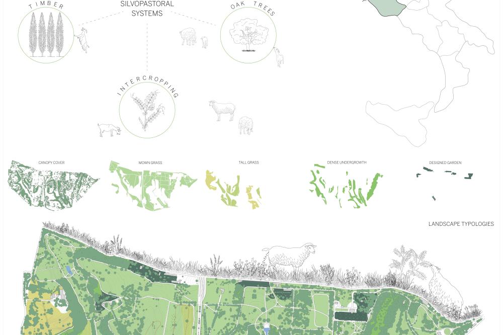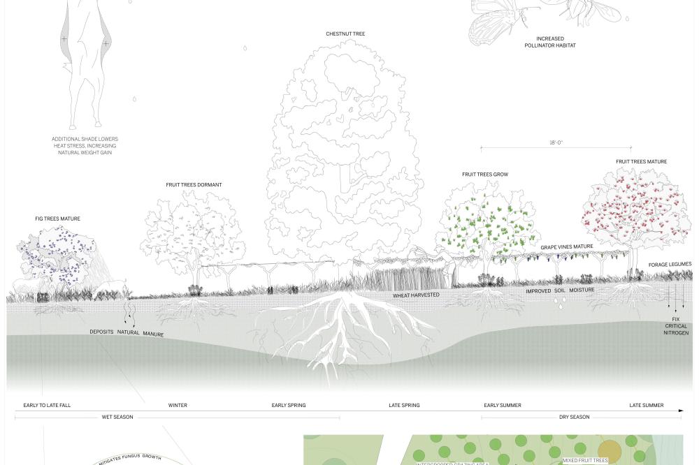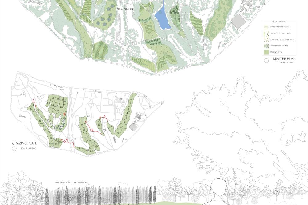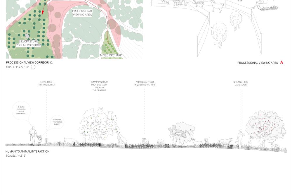 For this project, the management of grazing animals was the design driver for this processional agricultural experience. Integrating the concept of transhumance into a silvoarable system changes it to a silvopastoral system. While these different systems are typically practiced separately, this series of connected gardens combines them in different ways from one area to the next, significantly increasing biodiversity, improving soil health and fostering a regenerative ecosystem.