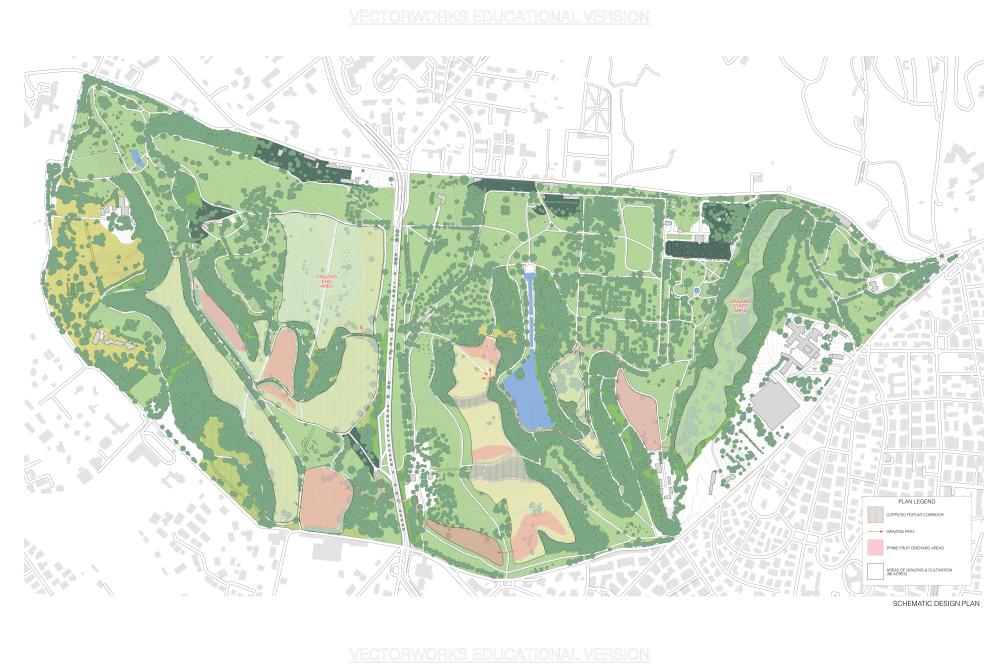 Now, the final processional park covers about 104 acres of the 490 acre Villa Doria Pamphilj. With the massive scale of this park in mind, the primary focus was not on the design of the individual spaces, rather the coordination and master plan of the grazing schedule, educational experience, and ecological benefits of combining these agricultural practices.