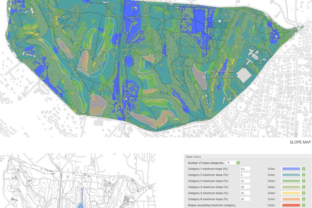 Slopes were analyzed using a digital site model created from a 1950’s 2 meter contour map. Many fruit trees prefer full sun exposure and well draining soils, so areas with a decent slope, primarily facing southwest, were highlighted as optimal orchard locations.